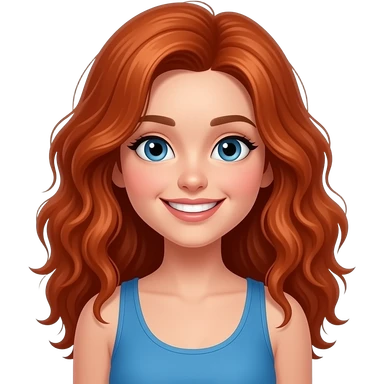 Girl with blue eyes, long red frizzy, volumous hair. Blue tank top. Big smile showing teeth. emoji