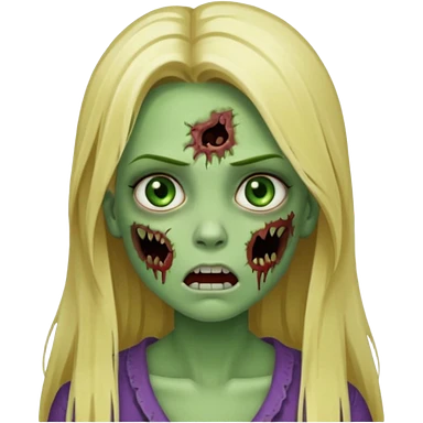 Zombie girl with green skin, visible bruises on face, mouth open showing teeth, long blonde hair with straight bangs emoji