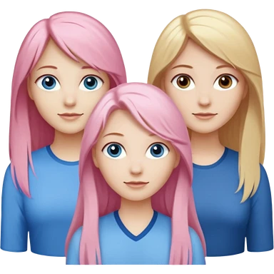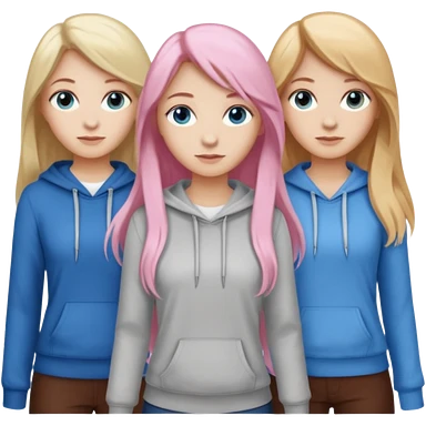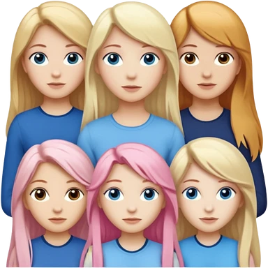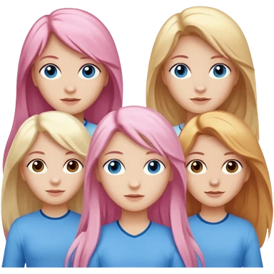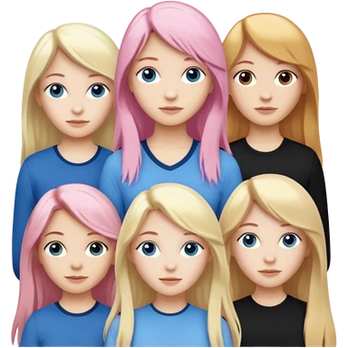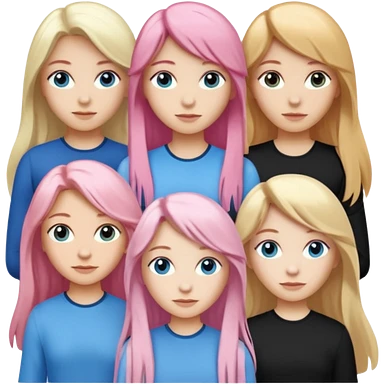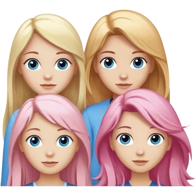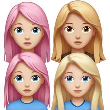 Girlfriend emoji - include 1 white girl with long light pink hair and blue eyes, one white girl with blue eyes and light blonde hair, and 2 white girls with brown eyes and long dark brown hair. They are smiling and hugging emoji