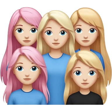 Girlfriend emoji - four white grips hugging and smiling One girl with long light pink hair and blue eyes, one girl with blue eyes and light blonde hair, and 2 girls with brown eyes and long dark brown hair. emoji