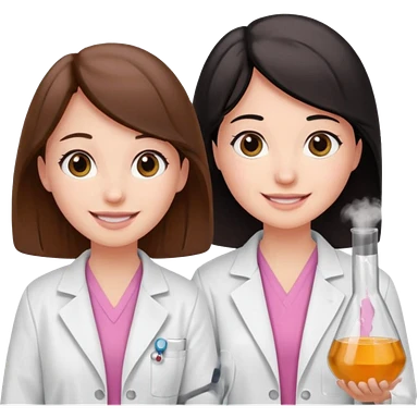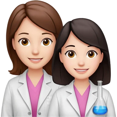 cientificas con blusa rosa y bata blanca felices, una chica con pelo marrón y otra chica con pelo negro emoji