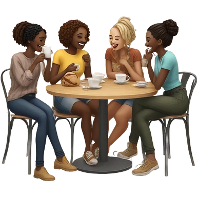 "Cartoon emoji of a girl with long, straight light brown hair, fair skin, brown eyes. Wearing a stylish white top and chic pants. Sitting at a café table, laughing and smiling, full of joy. Next to her, two friends: one blonde, one with black hair, one with brown hair. Smooth, simple, stylized emoji