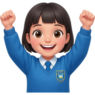 primary school girl celebrating wearing a blue uniform with a river primary school badge. Arms in the air big smile on face emoji