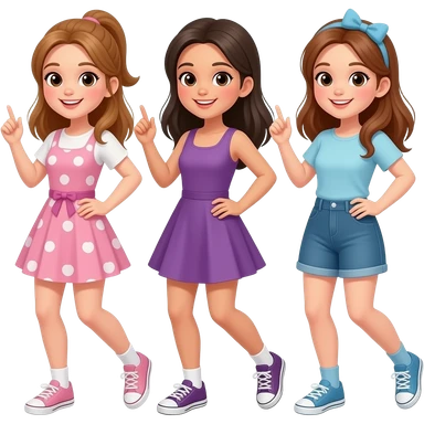 3 girls, first girl: black long wavy hair, tan, brown eyes, round black glasses, winking , second girl: brown long straight hair, hazel eyes, white skin, happy expression, third girl: hazel eyes, brown mid length hair, smirking emoji