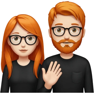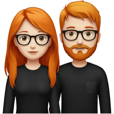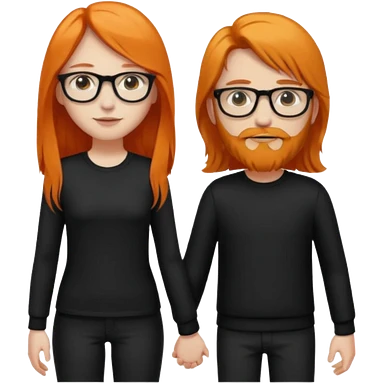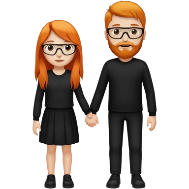 girl with long orange hair wearing no glasses and all black clothes and holding hands with boy with dark hair and beard and glasses and pale skin emoji