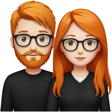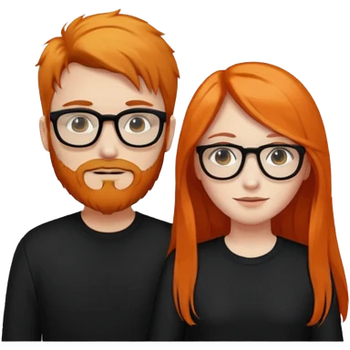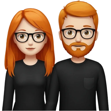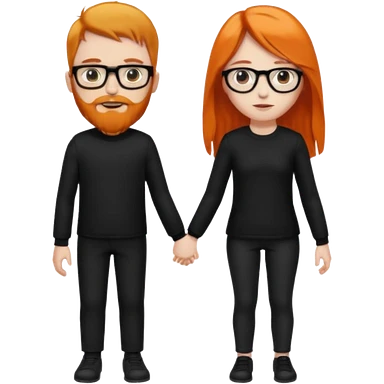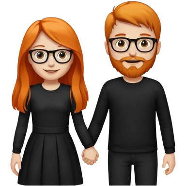 girl with long orange hair wearing no glasses and all black clothes and holding hands with boy with brown hair and beard and glasses and pale skin emoji
