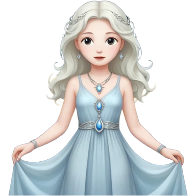 tall, ethereal goddess with glowing blue-white skin, long flowing black hair, glowing white eyes, and large shadowy wings. She wears a sleek, ancient Greek-style gown in deep midnight tones. Dark cosmic energy swirls around her, with stars and shadows trailing from her presence.” emoji