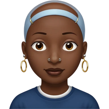 Make a emoji of a person with dark skin and has a nose ring and has a bunch of small earrings and a big earring and who has a tiny bit of hair and who has a gap between her two front teeth and with no hair emoji