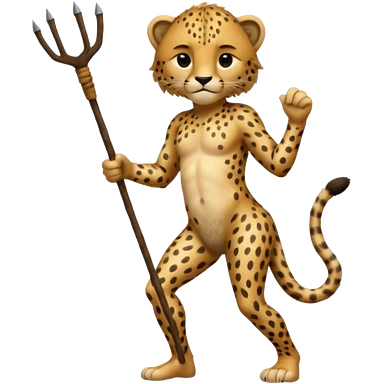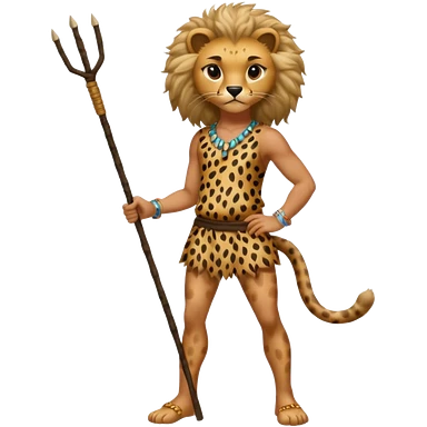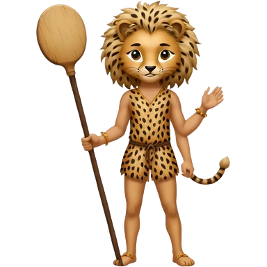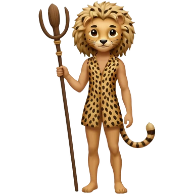 Give me a human who has hunch back and wearing cheetah print clothes lot of hair on his body show full body and has a stick in his hand emoji | AI Emoji Generator