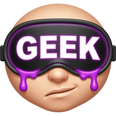 Give me a regular emoji with a sleeping mask that says "GEEK" and add neon purple drool to the corners of his half opened mouth emoji
