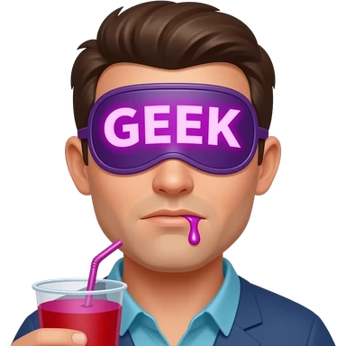 Give me a regular emoji with a sleeping mask that says "GEEK" and add neon purple drool to the corner of his half opened mouth and add a red plastic cup to his left with neon purple juice emoji