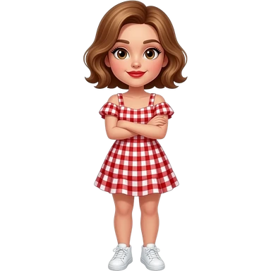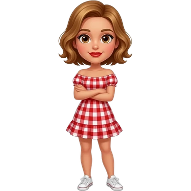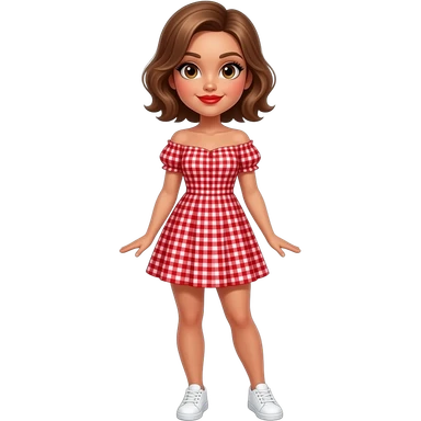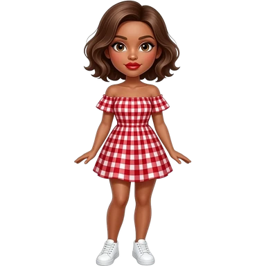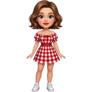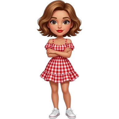 glamours,-tanned,-very-beautiful-girl,-with-big-plump-red-lips,-long-long-lashes,-honey-silky-very short- hair,-wavy-hair,-hazel-eyes- wearing- red-gingham-frill - dress- white-sneakers-shrugging-her-shoulders-full-body emoji