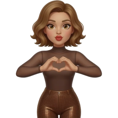 glamours,-tanned,-very-beautiful-woman-with-big-plump-red-lips,-long-lashes,-honey-silky-very short- hair,-wavy-hair,-hazel-eyes-that-are-smiling-wearing-Chocolate-brown-sheer-Long-sleeved-bodysuit-Brown-sequinned-pants-Her-eyes-sparkle-mouth-blowing-kiss-hands-up-making-a-heart-symbol- emoji | AI Emoji Generator