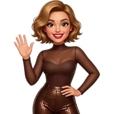 glamours,-tanned,-very-beautiful-woman-with-big-plump-red-lips,-long-lashes,-honey-silky-very short- hair,-wavy-hair,-hazel-eyes- wearing-Chocolate-brown-sheer-Long-sleeved-bodysuit-Brown-sequinned-pants-Her-eyes-sparkle-and-she-is-smiling-Hand-up-waving-hello emoji