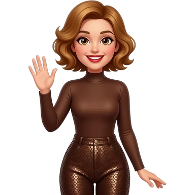 glamours,-tanned,-very-beautiful-woman-with-big-plump-red-lips,-long-lashes,-honey-silky-very short- hair,-wavy-hair,-hazel-eyes- wearing-Chocolate-brown-Long-sleeved-bodysuit-Brown-sequinned-pants-Her-eyes-sparkle-and-she-is-smiling-Hand-up-waving-hello emoji