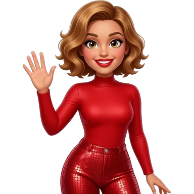 glamours,-tanned,-very-beautiful-woman-with-big-plump-red-lips,-long-lashes,-honey-silky-very short- hair,-wavy-hair,-hazel-eyes- wearing-Red-Long-sleeved-bodysuit-Red-sequinned-pants-Her-eyes-sparkle-and-she-is-smiling-Hand-up-waving-hello emoji