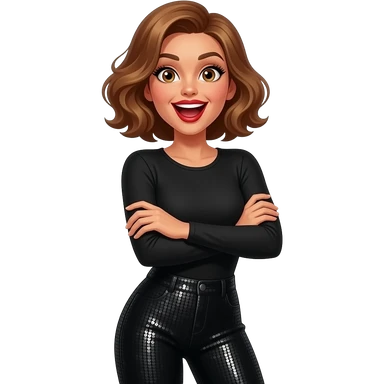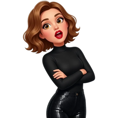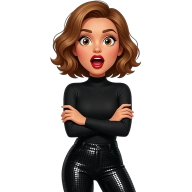 glamours,-tanned,-very-beautiful-woman-with-big-plump-red-lips,-long-long-lashes,-honey-silky-very short- hair,-wavy-hair,-hazel-eyes- wearing-black-Long-sleeved-bodysuit-and-black-sequinned-pants-eyes-wide-open-look-of-shock-mouth-open wide-arms-crossed-throwing head back-waist-up emoji
