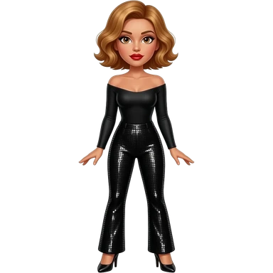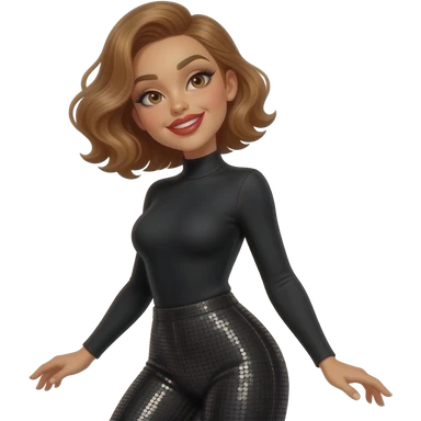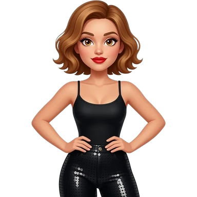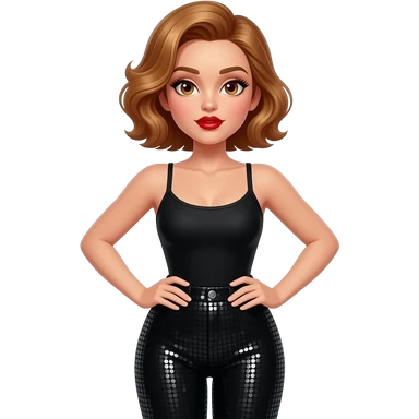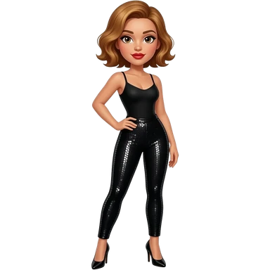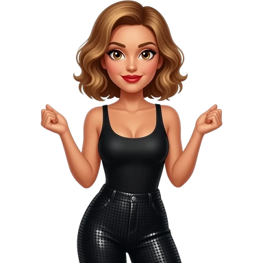 glamours,-woman-shrugging-tanned,-very-beautiful-girl,-with-big-plump-red-lips,-long-long-lashes,-honey-silky-very short- hair,-wavy-hair,-hazel-eyes- wearing-black-bodysuit-and-black-sequinned-pants-black-stilettos-shrugging-full-body emoji