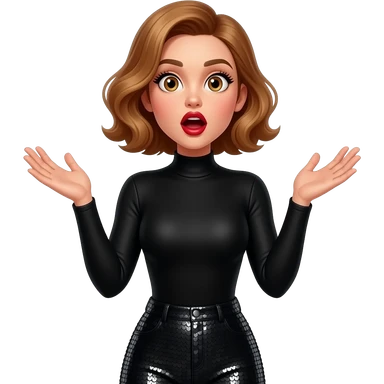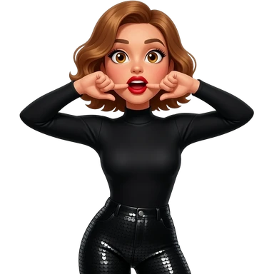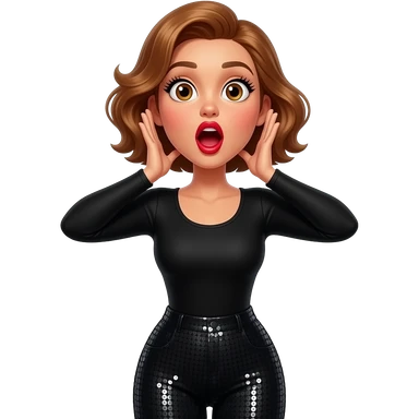 glamours,-tanned,-very-beautiful-woman-with-big-plump-red-lips,-long-lashes,-honey-silky-very short- hair,-wavy-hair,-hazel-eyes- wearing-black-Long-sleeved-bodysuit-black-sequinned-pants-eyes-wide-open-look-of-surprise-and-mouth-open-round-hands-either-side-of-mouth-throwing head back-waist-up emoji