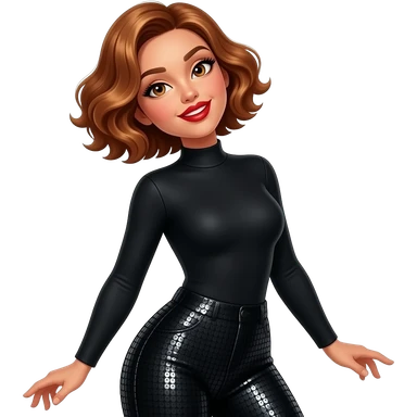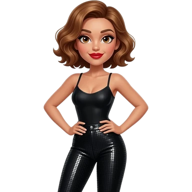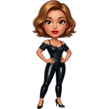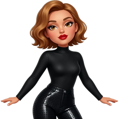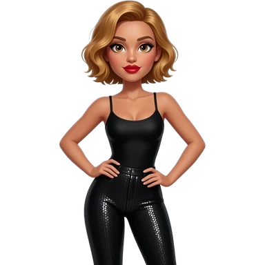 glamours,-tanned,-very-beautiful-woman-with-big-plump-red-lips,-long-long-lashes,-honey-silky-very short- hair,-wavy-hair,-hazel-eyes- wearing-black-bodysuit-and-black-sequinned-pants-black-stilettos-shrugging-waist-up emoji