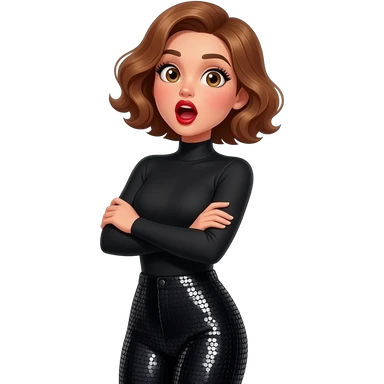 glamours,-tanned,-very-beautiful-woman-with-big-plump-red-lips,-long-long-lashes,-honey-silky-very short- hair,-wavy-hair,-hazel-eyes- wearing-black-Long-sleeved-bodysuit-and-black-sequinned-pants-eyes-wide-open-look-of-surprise-and-mouth-open-round- wide-arms-crossed-throwing head back-waist-up emoji