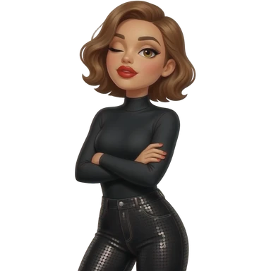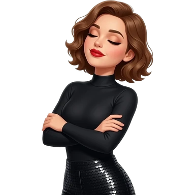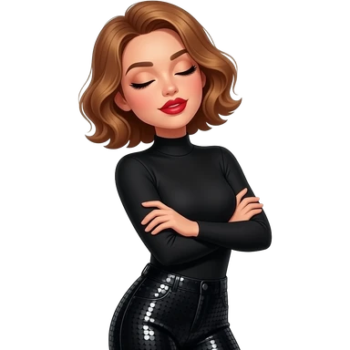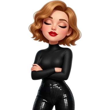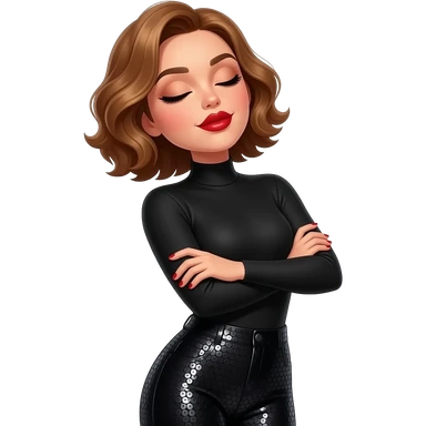 glamours,-tanned,-very-beautiful-woman-with-big-plump-red-lips,-long-long-lashes,-honey-silky-very short- hair,-wavy-hair,-hazel-eyes- wearing-black-Long-sleeved-bodysuit-and-black-sequinned-pants-eye-half-closed-with-pupils-up-&-mouth-closed-arms-crossed-throwing head back-waist-up emoji