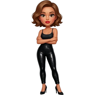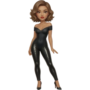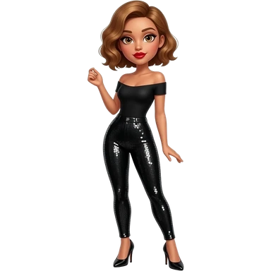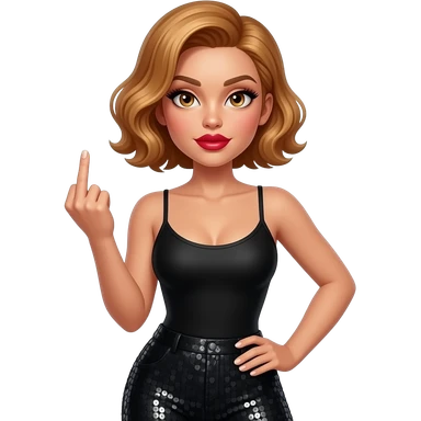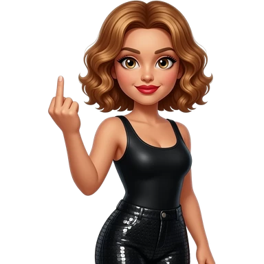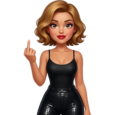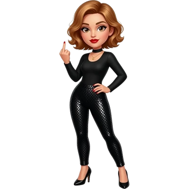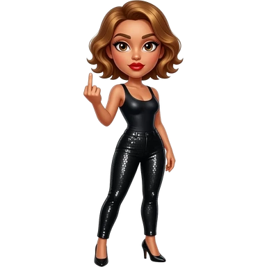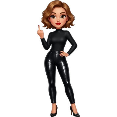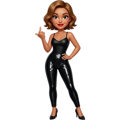 glamours,-tanned,-very-beautiful-woman-with-big-plump-red-lips,-long-long-lashes,-honey-silky-very short- hair,-wavy-hair,-hazel-eyes- wearing-black-Long-sleeved-bodysuit-and-black-sequinned-pants-black-black stilettos-and-sticking-up-middle-finger-full body emoji