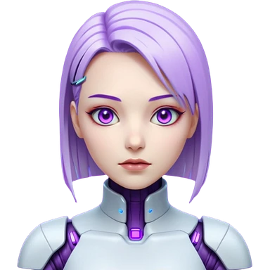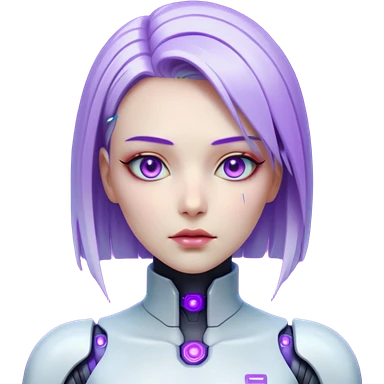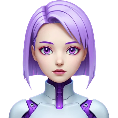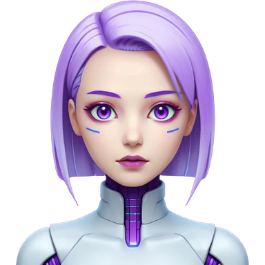 Cyberpunk female android, perfect porcelain skin, glowing artificial eyes, visible faint seams on neck, sleek metallic hair, expressionless, vibrant violet lighting emoji