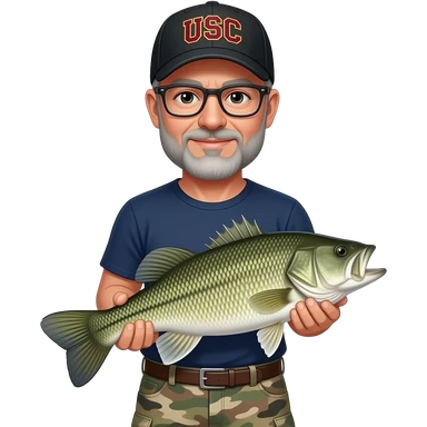 an adult man with a gray beard with a navy blue sleeve T-shirt, and camouflage carpenter shorts and black baseball hat with USC in burgundy wearing glasses holding a bass fish emoji