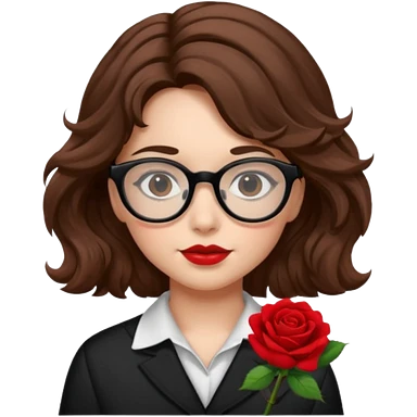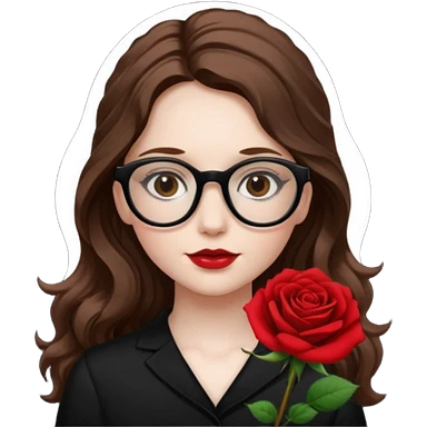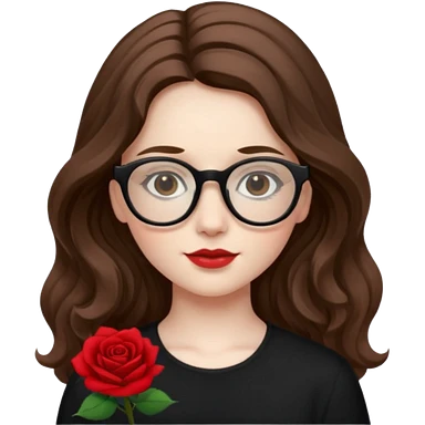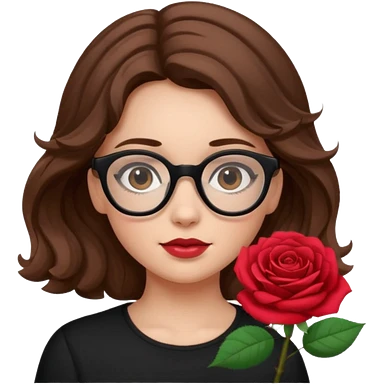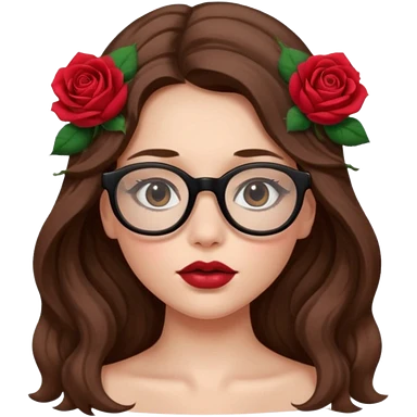 Una ragazza con capelli castani mossi e lunghi e indossi occhiali neri e con una piccola rosa nella testa. Le labbra devono essere color carne, senza rossetto emoji