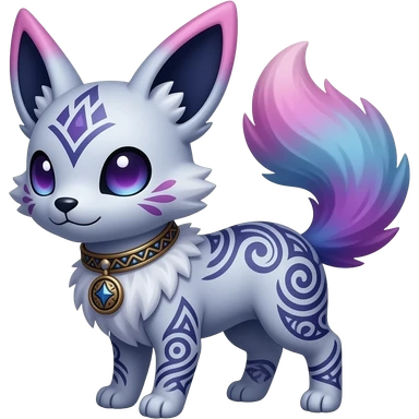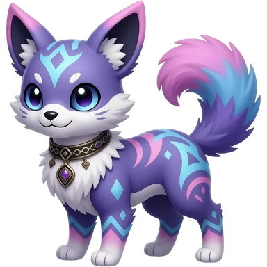 Rare colorful bluish purplish pinkish gradients furry fuzzy silvery exotic cute epic aesthetic gothic colorful Salandit-Eevee-Civet-species-Fakemon-hybrid-creature, with a collar, and with intricate tribal markings, full body emoji