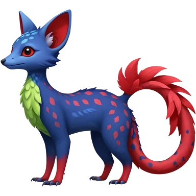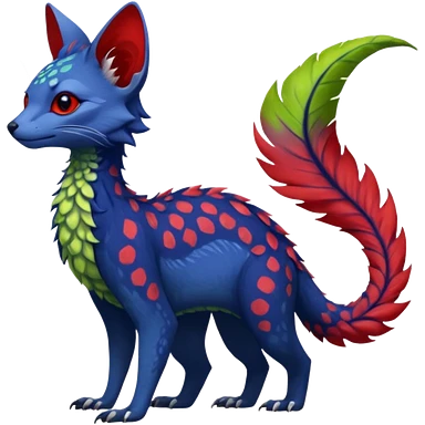 Feral Rare Fantasy vibrant tropical red and indigo and lime-collred Vernid-Trico-species-creature by LiLaiRa, random markings, tufted tail, tufted ears, full body emoji