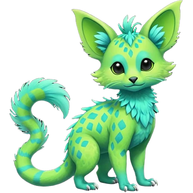 Feral Rare Fantasy vibrant tropical exotic neon-lime green and cyan Vernid-Trico-species-creature by LiLaiRa, random markings, tufted tail, tufted ears, full body emoji