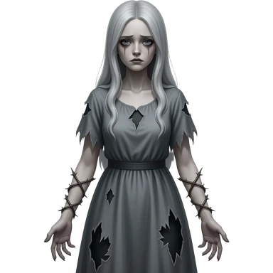 Gloomy ghostly fair lady with long ragged torn tattered dress, thorns across arms and legs, depressed emoji