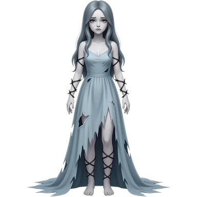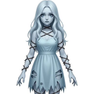 Gloomy ghostly fair lady with long ragged torn tattered dress, thorns across arms and legs, depressed grey blue emoji
