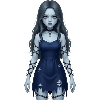Gloomy ghostly fair lady with long ragged torn tattered navy blue dress, thorns across arms and legs, depressed grey blue emoji