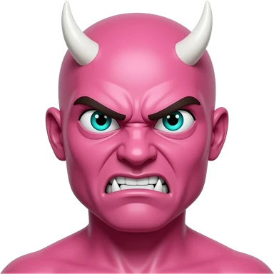 Glossy pink devil emoji with small white horns, sharp teal eyes, and tiny triangular fangs, giving an angry, mischievous expression. emoji | AI Emoji Generator