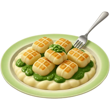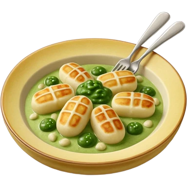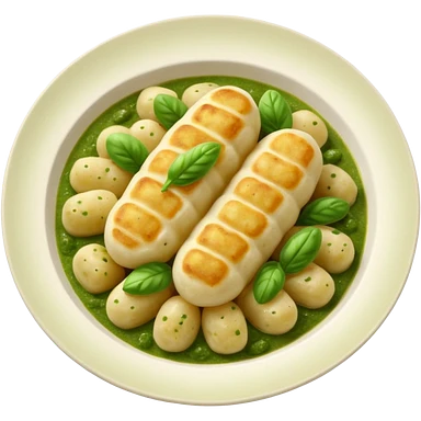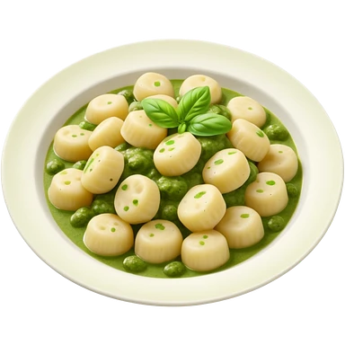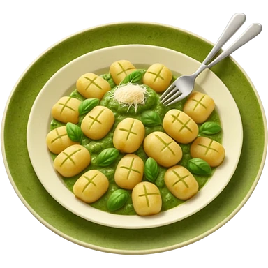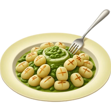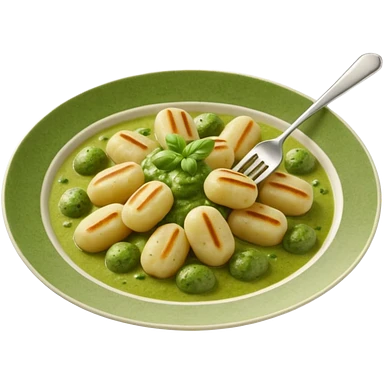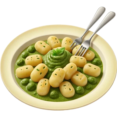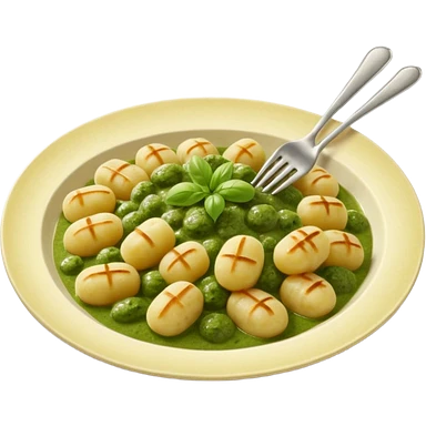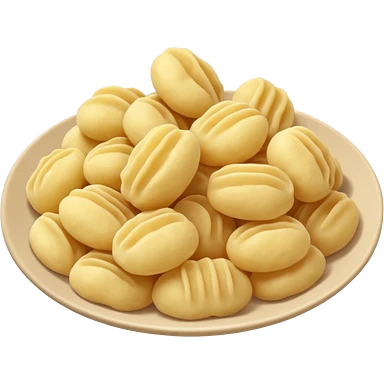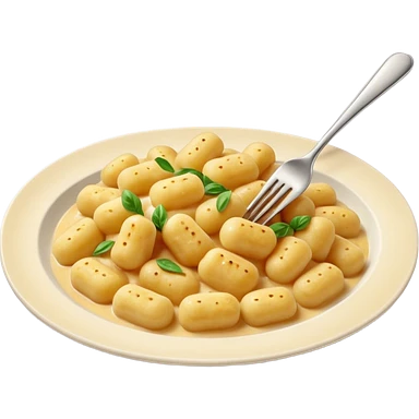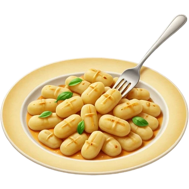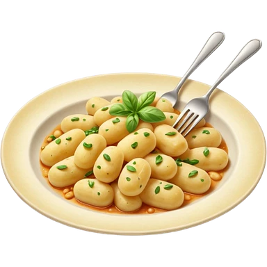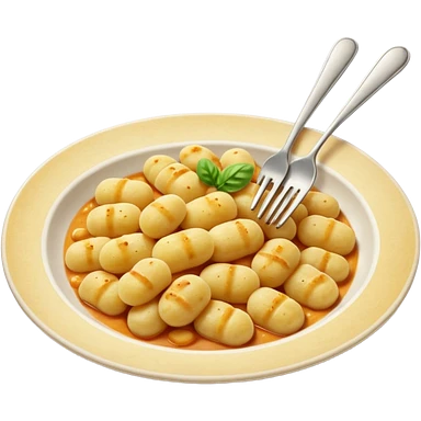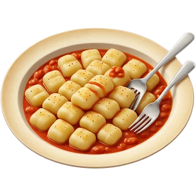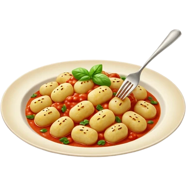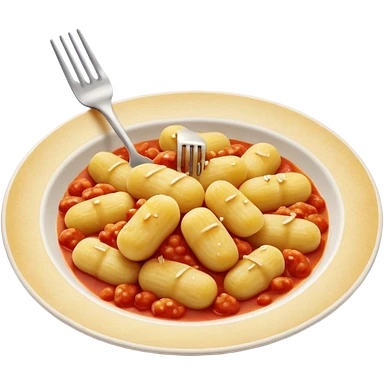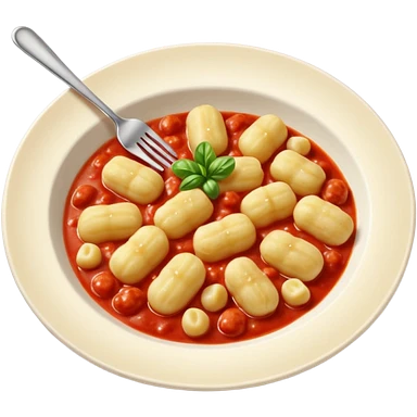 Gnocchi Cinematic Realistic Gnocchi Dish Emoji, depicted as tender oblong potato gnocchi garnished with iconic fork marks on top, rendered with soft textures and warm, inviting lighting. add tomato sauce emoji | AI Emoji Generator