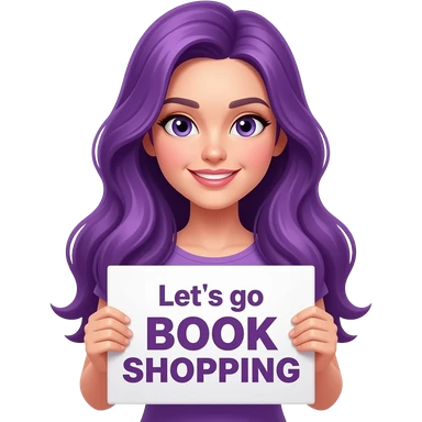 girl with long purple hair holding a Let's go BOOK SHOPPING sign emoji