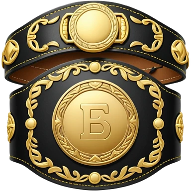 Boxing champion with arms raised in victory, wearing multiple championship belts around waist, determined expression, white hand wraps, muscular cartoon body emoji