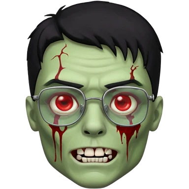 homem zumbi de óculos cabelo preto com muita olheira deixar pele dele verde dentes brancos e olhos vermelhos e ensanguentados deixar óculos quadrado e preto e olhos cheio de veias vermelhas e encher o rosto de piercings emoji
