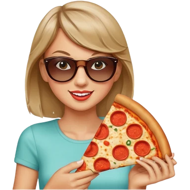 Taylor Swift, wearing sun glasses, holding a slice of pizza emoji