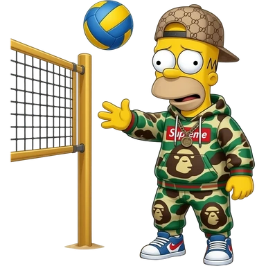 very sad bart simpson with hypebeast clothe like supreme bape playing beach volley gucci off white emoji