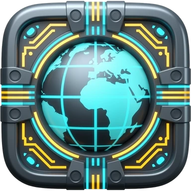 Minimalist 3D icon, high-tech network globe internet symbol, dark metal casing with circuit patterns, glowing cyan and gold neon lights, futuristic infrastructure aesthetic, centered, high resolution, isolated on black background. emoji