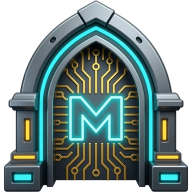 Minimalist 3D icon, mechanical gothic arch with glowing neon M logo, circuit board patterns, dark metal, cyan and gold light, sharp details, futuristic infrastructure aesthetic, centered, high resolution, isolated on black. emoji