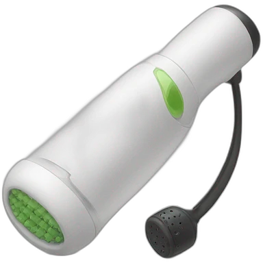 a white handheld massager with a rounded, padded head and a long handle. The handle features a blue accent area with a small black switch in the center, and a cord emerging from the bottom. The head is slightly larger than the handle and attached with a short blue neck emoji