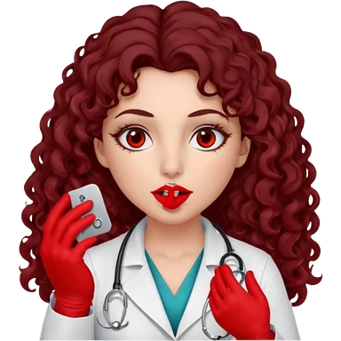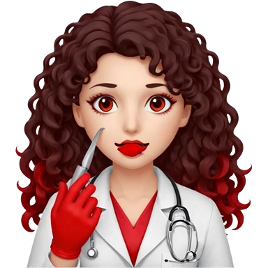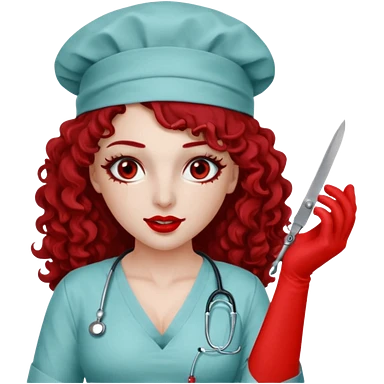 Lilith scalpel in hand, evil surgeon sexy surgeon clothes. She has red eyes. She has dark brown long curly hair. Wears sexy doctor outfit with red gloves. Covers mouth neck and nose with red litham only covering under her nose to hide her identity emoji