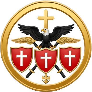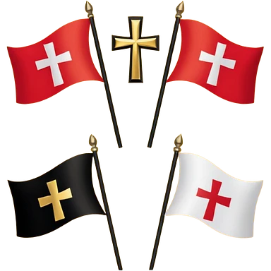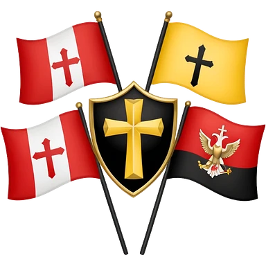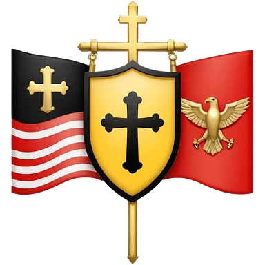 Flags: There are four flags, two on the top and two on the bottom, in the black and gold (yellow) quarters. Each flag features a gold Coptic cross.: In the center, there is a white shield or banner with a red eagle or bird, emoji