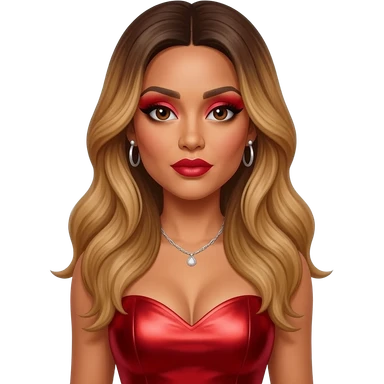 Adrienne Bailon from 3lw with brown eyes, long golden brown hair, red eyeshadow and lipstick, red metallic sweetheart dress, silver necklace and earrings emoji