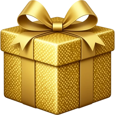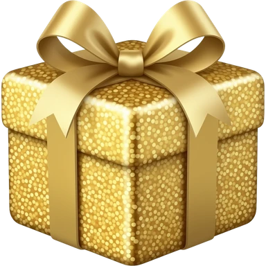 A charming emoji of a small gift box wrapped in champagne gold paper with a shiny pink ribbon bow, surrounded by golden sparkles and light rays, luxurious and glittery, beauty gift aesthetic emoji